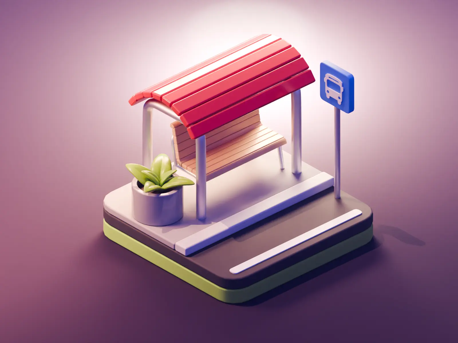 Isometric model of a bus stop featuring a red-roofed bench, a roadside base, a bus sign, and a small green plant.