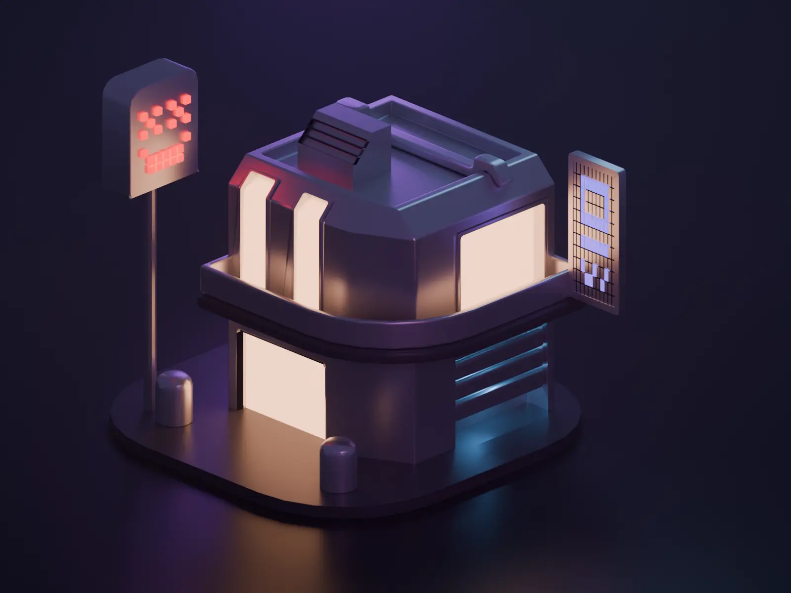 A dark, futuristic isometric building diorama with metal accents, cyan and magenta neon lights, and an illuminated digital billboard.