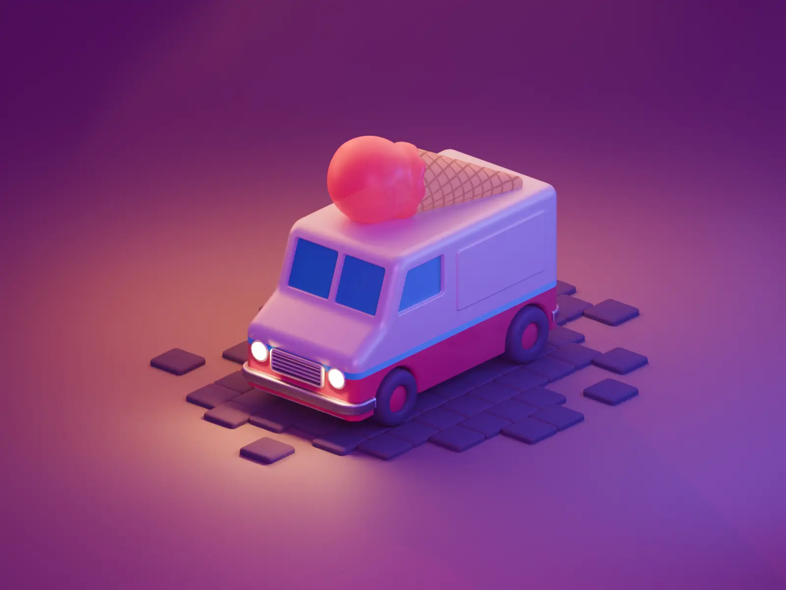An isometric diorama of a pink and white vintage ice cream truck with a large cone and scoop on its roof, in a purple setting.