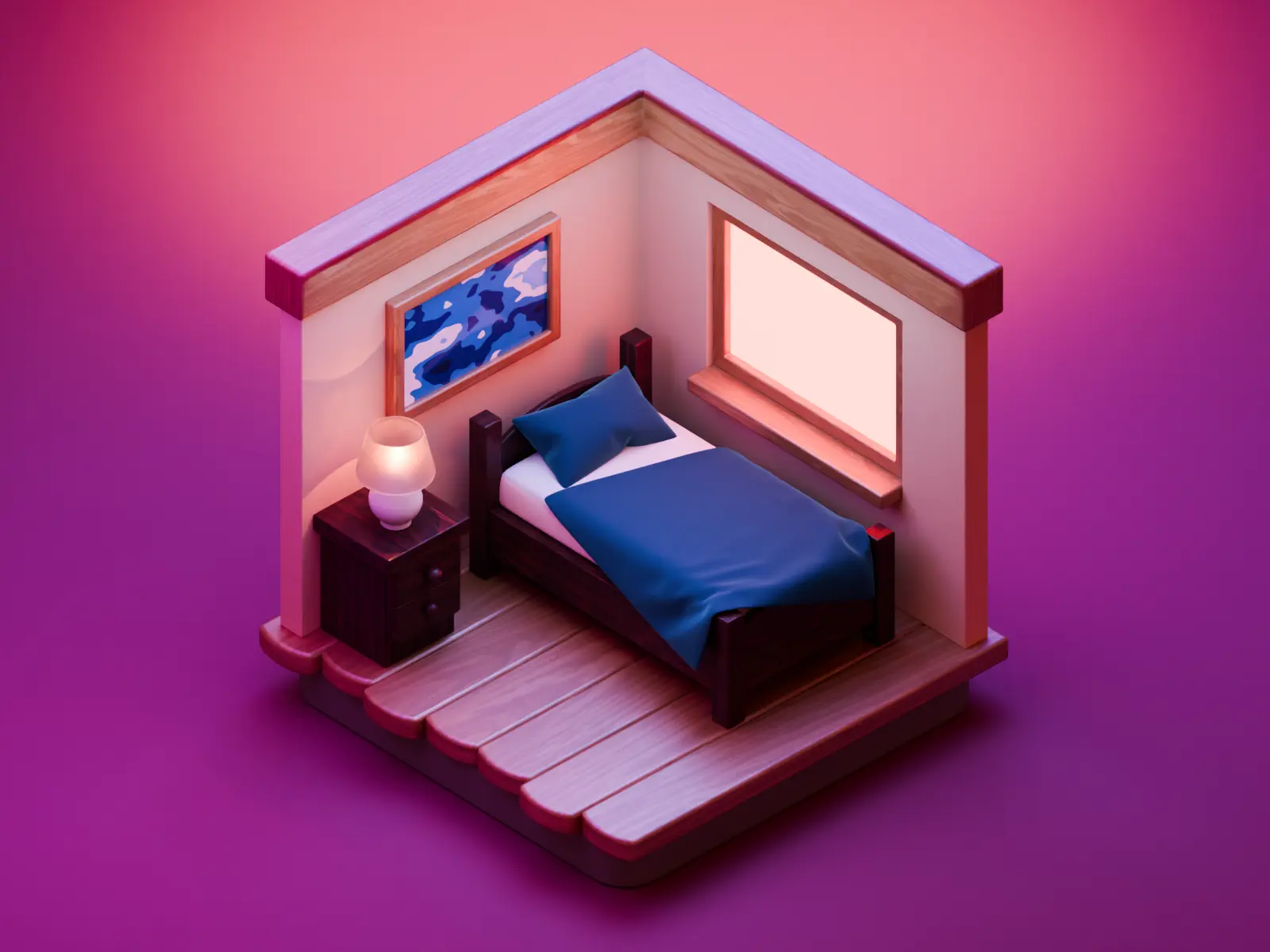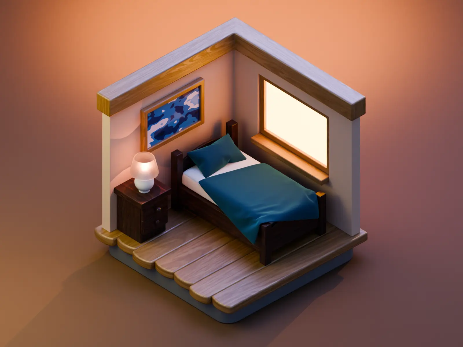 A warm, isometric diorama of a simple bedroom featuring a bed, a nightstand with a lamp, and a painting on the wall.